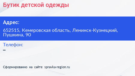 Бутик детской одежды по адресу 652515, Кемеровская область, Ленинск-Кузнецкий, Пушкина, 90 в дальнейшем Организация, размещена в следующих категориях: