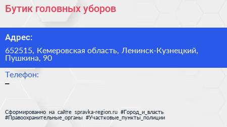 Бутик головных уборов по адресу 652515, Кемеровская область, Ленинск-Кузнецкий, Пушкина, 90 в дальнейшем Организация, размещена в следующих категориях: