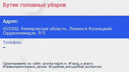 Бутик головных уборов по адресу 652502, Кемеровская область, Ленинск-Кузнецкий, Орджоникидзе, 9/5 в дальнейшем Организация, размещена в следующих категориях: