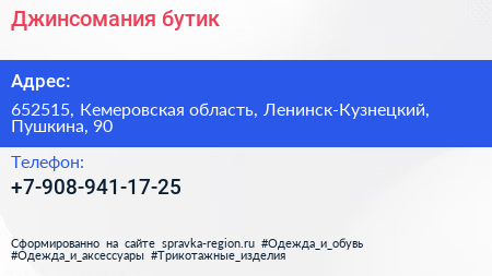 Джинсомания, бутик по адресу 652515, Кемеровская область, Ленинск-Кузнецкий, Пушкина, 90 в дальнейшем Организация, размещена в следующих категориях: