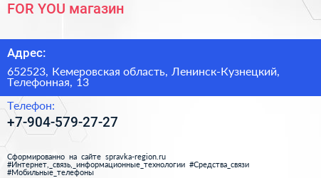FOR YOU, магазин по адресу 652523, Кемеровская область, Ленинск-Кузнецкий, Телефонная, 13 в дальнейшем Организация, размещена в следующих категориях: