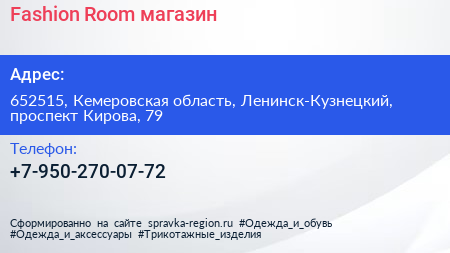 Fashion Room, магазин по адресу 652515, Кемеровская область, Ленинск-Кузнецкий, проспект Кирова, 79 в дальнейшем Организация, размещена в следующих категориях: