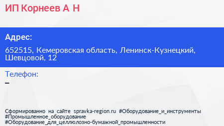 ИП Корнеев А.Н. по адресу 652515, Кемеровская область, Ленинск-Кузнецкий, Шевцовой, 12 в дальнейшем Организация, размещена в следующих категориях: