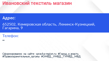 Ивановский текстиль, магазин по адресу 652502, Кемеровская область, Ленинск-Кузнецкий, Гагарина, 9 в дальнейшем Организация, размещена в следующих категориях: