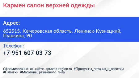 Кармен, салон верхней одежды по адресу 652515, Кемеровская область, Ленинск-Кузнецкий, Пушкина, 90 в дальнейшем Организация, размещена в следующих категориях: