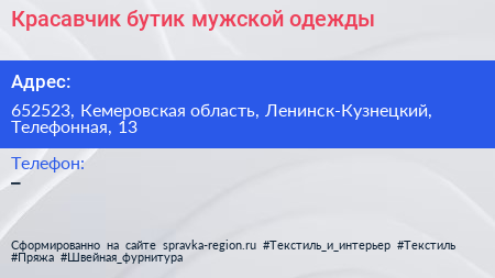 Красавчик, бутик мужской одежды по адресу 652523, Кемеровская область, Ленинск-Кузнецкий, Телефонная, 13 в дальнейшем Организация, размещена в следующих категориях:
