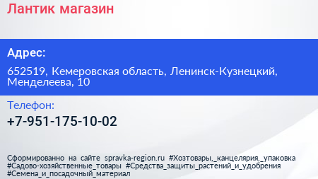 Лантик, магазин по адресу 652519, Кемеровская область, Ленинск-Кузнецкий, Менделеева, 10 в дальнейшем Организация, размещена в следующих категориях: