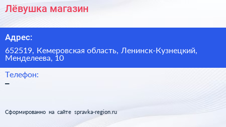 Лёвушка, магазин по адресу 652519, Кемеровская область, Ленинск-Кузнецкий, Менделеева, 10 в дальнейшем Организация, размещена в следующих категориях: