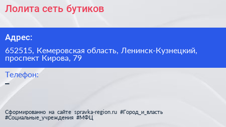 Лолита, сеть бутиков по адресу 652515, Кемеровская область, Ленинск-Кузнецкий, проспект Кирова, 79 в дальнейшем Организация, размещена в следующих категориях: