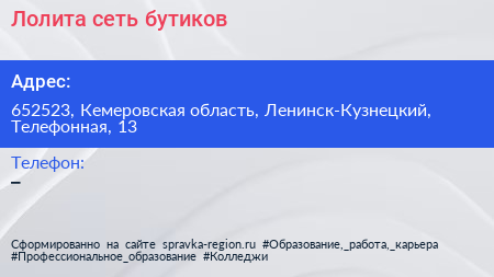 Лолита, сеть бутиков по адресу 652523, Кемеровская область, Ленинск-Кузнецкий, Телефонная, 13 в дальнейшем Организация, размещена в следующих категориях: