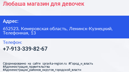 Любаша, магазин для девочек по адресу 652523, Кемеровская область, Ленинск-Кузнецкий, Телефонная, 13 в дальнейшем Организация, размещена в следующих категориях: