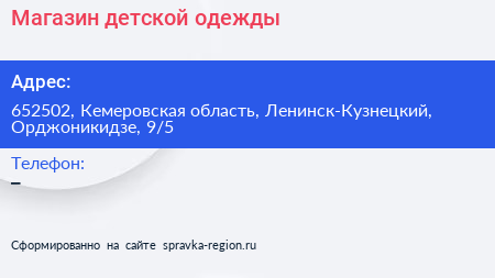 Магазин детской одежды по адресу 652502, Кемеровская область, Ленинск-Кузнецкий, Орджоникидзе, 9/5 в дальнейшем Организация, размещена в следующих категориях: