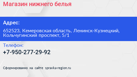 Магазин нижнего белья по адресу 652523, Кемеровская область, Ленинск-Кузнецкий, Кольчугинский проспект, 5/1 в дальнейшем Организация, размещена в следующих категориях: