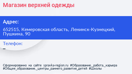 Магазин верхней одежды по адресу 652515, Кемеровская область, Ленинск-Кузнецкий, Пушкина, 90 в дальнейшем Организация, размещена в следующих категориях: