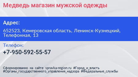 Медведь, магазин мужской одежды по адресу 652523, Кемеровская область, Ленинск-Кузнецкий, Телефонная, 13 в дальнейшем Организация, размещена в следующих категориях: