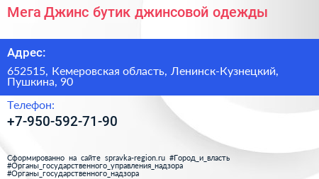 Мега Джинс, бутик джинсовой одежды по адресу 652515, Кемеровская область, Ленинск-Кузнецкий, Пушкина, 90 в дальнейшем Организация, размещена в следующих категориях: