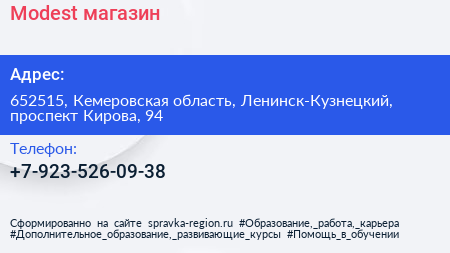 Modest, магазин по адресу 652515, Кемеровская область, Ленинск-Кузнецкий, проспект Кирова, 94 в дальнейшем Организация, размещена в следующих категориях: