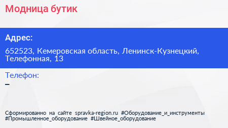 Модница, бутик по адресу 652523, Кемеровская область, Ленинск-Кузнецкий, Телефонная, 13 в дальнейшем Организация, размещена в следующих категориях: