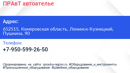 ПРАвТ, автоателье по адресу 652515, Кемеровская область, Ленинск-Кузнецкий, Пушкина, 90 в дальнейшем Организация, размещена в следующих категориях: