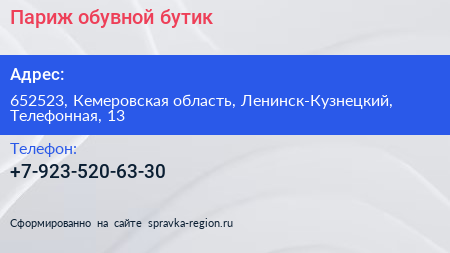 Париж, обувной бутик по адресу 652523, Кемеровская область, Ленинск-Кузнецкий, Телефонная, 13 в дальнейшем Организация, размещена в следующих категориях: