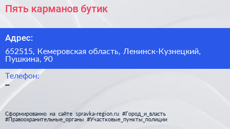 Пять карманов, бутик по адресу 652515, Кемеровская область, Ленинск-Кузнецкий, Пушкина, 90 в дальнейшем Организация, размещена в следующих категориях: