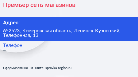 Премьер, сеть магазинов по адресу 652523, Кемеровская область, Ленинск-Кузнецкий, Телефонная, 13 в дальнейшем Организация, размещена в следующих категориях: