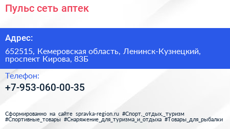 Пульс, сеть аптек по адресу 652515, Кемеровская область, Ленинск-Кузнецкий, проспект Кирова, 83Б в дальнейшем Организация, размещена в следующих категориях: