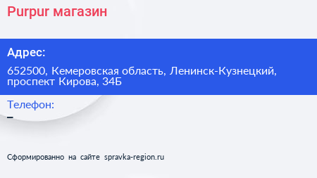 Purpur, магазин по адресу 652500, Кемеровская область, Ленинск-Кузнецкий, проспект Кирова, 34Б в дальнейшем Организация, размещена в следующих категориях: