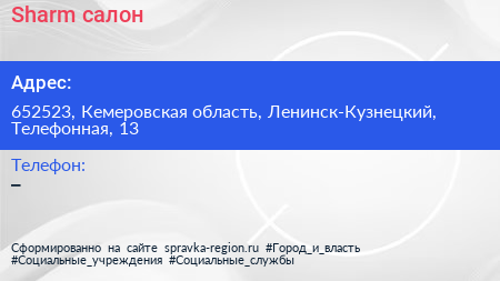 Sharm, салон по адресу 652523, Кемеровская область, Ленинск-Кузнецкий, Телефонная, 13 в дальнейшем Организация, размещена в следующих категориях: