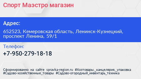 Спорт Маэстро, магазин по адресу 652523, Кемеровская область, Ленинск-Кузнецкий, проспект Ленина, 59/1 в дальнейшем Организация, размещена в следующих категориях: