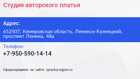 Студия авторского платья по адресу 652507, Кемеровская область, Ленинск-Кузнецкий, проспект Ленина, 48а в дальнейшем Организация, размещена в следующих категориях: