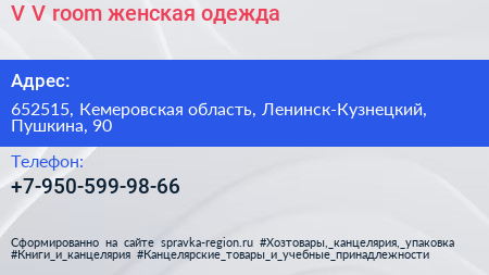 V&V room, женская одежда по адресу 652515, Кемеровская область, Ленинск-Кузнецкий, Пушкина, 90 в дальнейшем Организация, размещена в следующих категориях: