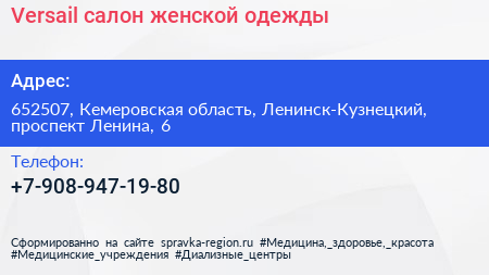 Versail, салон женской одежды по адресу 652507, Кемеровская область, Ленинск-Кузнецкий, проспект Ленина, 6 в дальнейшем Организация, размещена в следующих категориях: