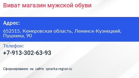 Виват, магазин мужской обуви по адресу 652515, Кемеровская область, Ленинск-Кузнецкий, Пушкина, 90 в дальнейшем Организация, размещена в следующих категориях: