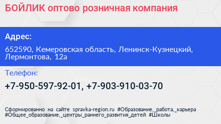 БОЙЛИК, оптово-розничная компания по адресу 652590, Кемеровская область, Ленинск-Кузнецкий, Лермонтова, 12а в дальнейшем Организация, размещена в следующих категориях: