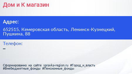 Дом и К, магазин по адресу 652515, Кемеровская область, Ленинск-Кузнецкий, Пушкина, 88 в дальнейшем Организация, размещена в следующих категориях: