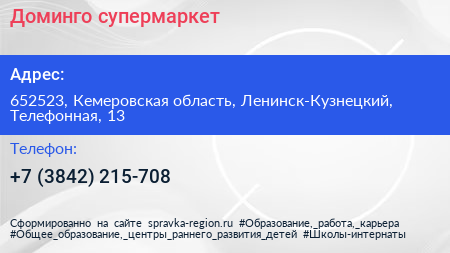 Доминго, супермаркет по адресу 652523, Кемеровская область, Ленинск-Кузнецкий, Телефонная, 13 в дальнейшем Организация, размещена в следующих категориях: