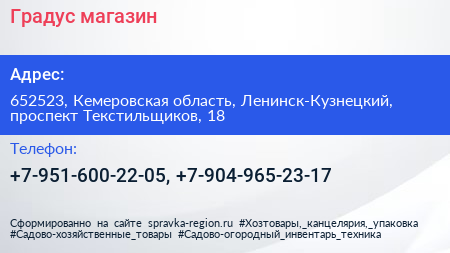 Градус, магазин по адресу 652523, Кемеровская область, Ленинск-Кузнецкий, проспект Текстильщиков, 18 в дальнейшем Организация, размещена в следующих категориях: