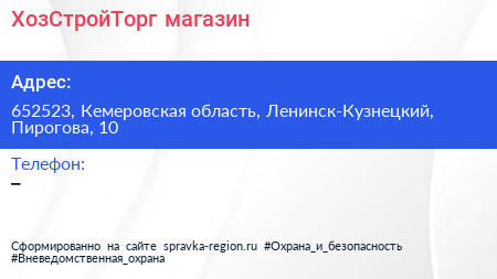 ХозСтройТорг, магазин по адресу 652523, Кемеровская область, Ленинск-Кузнецкий, Пирогова, 10 в дальнейшем Организация, размещена в следующих категориях: