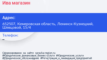 Ива, магазин по адресу 652507, Кемеровская область, Ленинск-Кузнецкий, Шевцовой, 15/4 в дальнейшем Организация, размещена в следующих категориях: