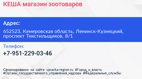 КЕША, магазин зоотоваров по адресу 652523, Кемеровская область, Ленинск-Кузнецкий, проспект Текстильщиков, 8/1 в дальнейшем Организация, размещена в следующих категориях: