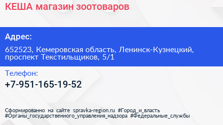 КЕША, магазин зоотоваров по адресу 652523, Кемеровская область, Ленинск-Кузнецкий, проспект Текстильщиков, 5/1 в дальнейшем Организация, размещена в следующих категориях: