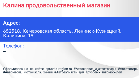 Калина, продовольственный магазин по адресу 652518, Кемеровская область, Ленинск-Кузнецкий, Калинина, 19 в дальнейшем Организация, размещена в следующих категориях:
