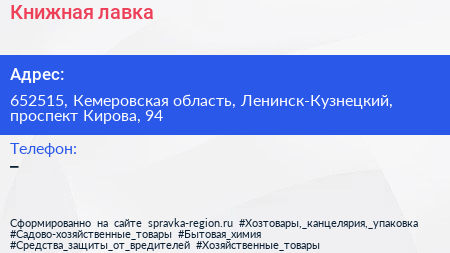 Книжная лавка по адресу 652515, Кемеровская область, Ленинск-Кузнецкий, проспект Кирова, 94 в дальнейшем Организация, размещена в следующих категориях: