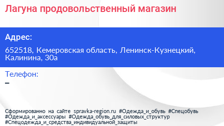 Лагуна, продовольственный магазин по адресу 652518, Кемеровская область, Ленинск-Кузнецкий, Калинина, 30а в дальнейшем Организация, размещена в следующих категориях: