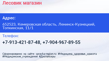 Лесовик, магазин по адресу 652523, Кемеровская область, Ленинск-Кузнецкий, Топкинская, 11/1 в дальнейшем Организация, размещена в следующих категориях: