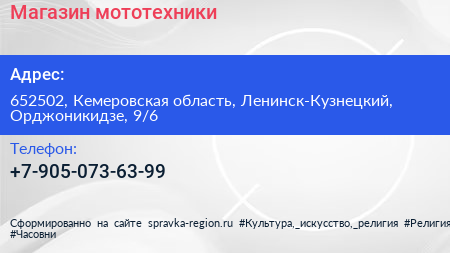 Магазин мототехники по адресу 652502, Кемеровская область, Ленинск-Кузнецкий, Орджоникидзе, 9/6 в дальнейшем Организация, размещена в следующих категориях: