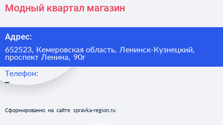 Модный квартал, магазин по адресу 652523, Кемеровская область, Ленинск-Кузнецкий, проспект Ленина, 90г в дальнейшем Организация, размещена в следующих категориях: