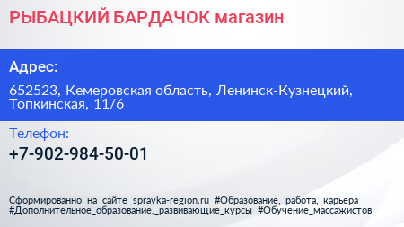 РЫБАЦКИЙ БАРДАЧОК, магазин по адресу 652523, Кемеровская область, Ленинск-Кузнецкий, Топкинская, 11/6 в дальнейшем Организация, размещена в следующих категориях: