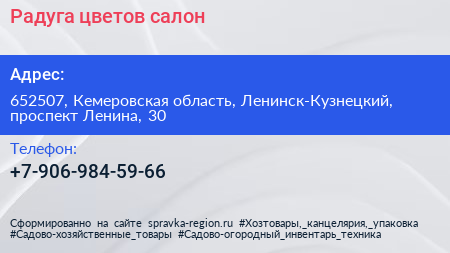 Радуга цветов, салон по адресу 652507, Кемеровская область, Ленинск-Кузнецкий, проспект Ленина, 30 в дальнейшем Организация, размещена в следующих категориях: